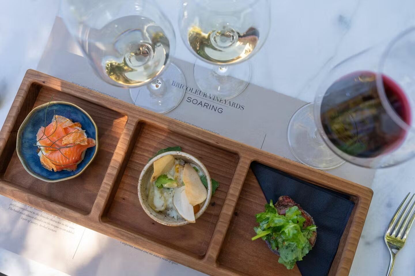 Soaring offers a lighter introduction to this philosophy—three Bricoleur wines paired with three small seasonal bites sourced from the estate and local farms. It's Bricoleur's way of saying great wine and food should be accessible, welcoming, and rooted in community.