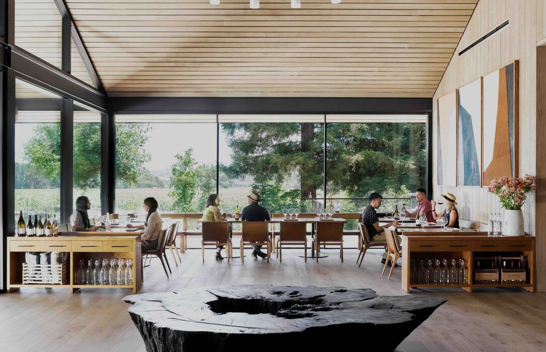 "We wanted to create a space that embodies the wild natural beauty of the far Sonoma Coast while offering accessibility and warmth," Chantal explains. Natural materials—bleached cypress, rammed earth, salvage wood—evoke the rugged coastal landscape. Thoughtful sequencing creates intimacy. Guests taste their coastal Pinot Noir and Chardonnay in lush gardens or intimate interiors, paired with seasonal bites from local farms.