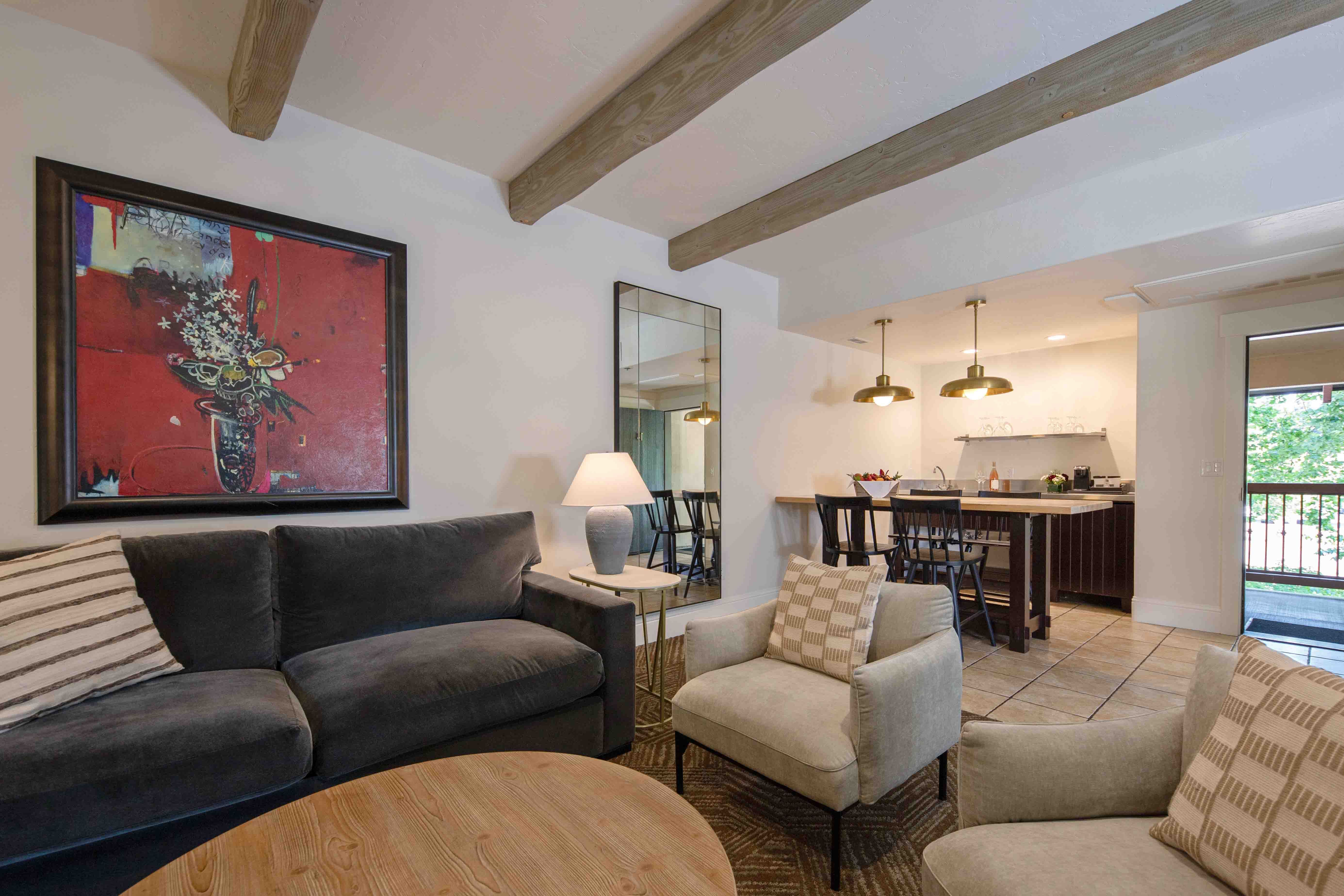 Luxuriously appointed with artisanal furnishings and natural textures, our Suites offer separate living spaces and secluded sleeping quarters for sophisticated comfort. French doors open to private terraces or patios overlooking our botanical grounds.